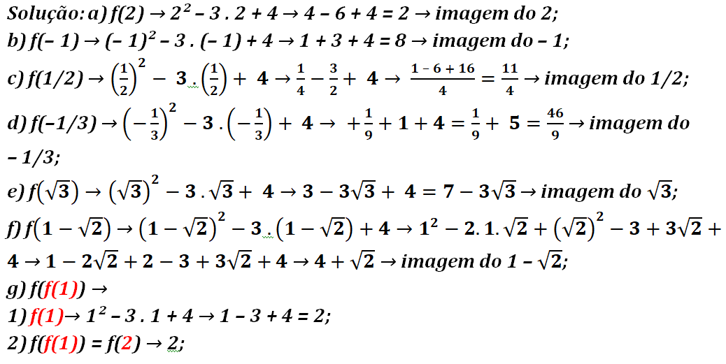 Solução: a) f(2) → 3 . 2 – 2 = 4 → imagem do 2;